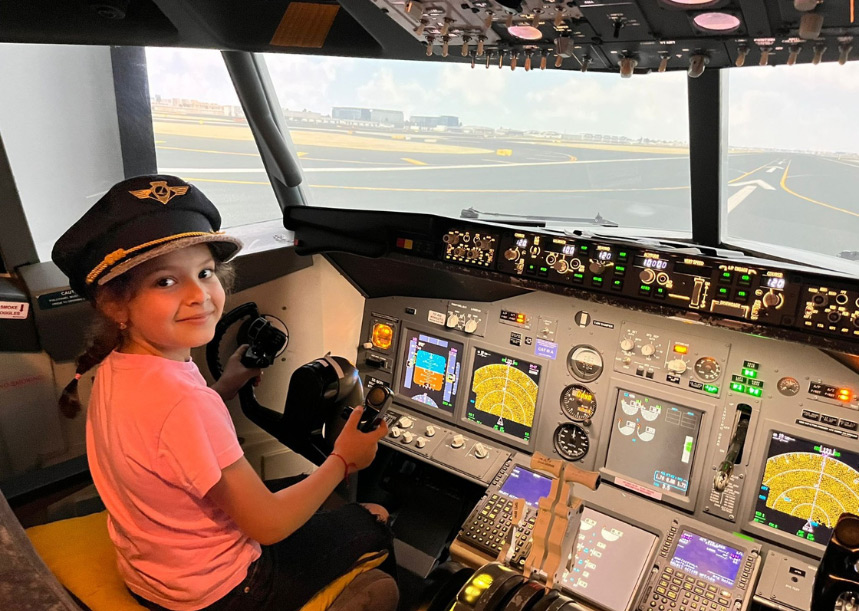 Copiii au ocazia să intre în cabina de pilotaj a unui avion de pasageri, să afle cum arată „biroul” piloților și să trăiască emoția manevrelor de zbor din scaunul căpitanului, alături de instructorii noștri cu experiență. Este o activitate interactivă și educativă, perfectă pentru elevii de grădiniță, ciclul primar și gimnazial.